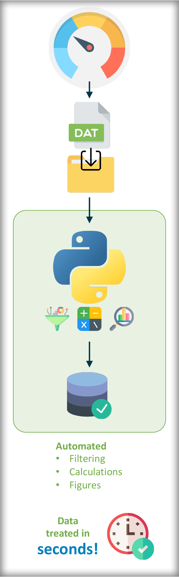 Copy and pasting from one file to the other is easily avoided! An app can wait for new data to arrive in a specified folder and automatically treat it based on a script. This way, relevant information is extracted, calculations applied, results (incl. figures) produced and saved in a folder or database. Depending on data volume and calculations, this can happen within a few seconds per file.