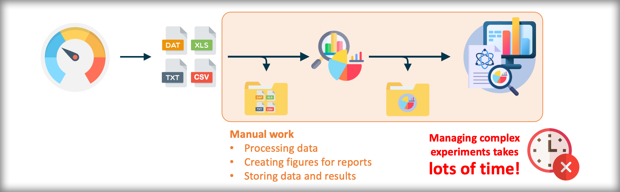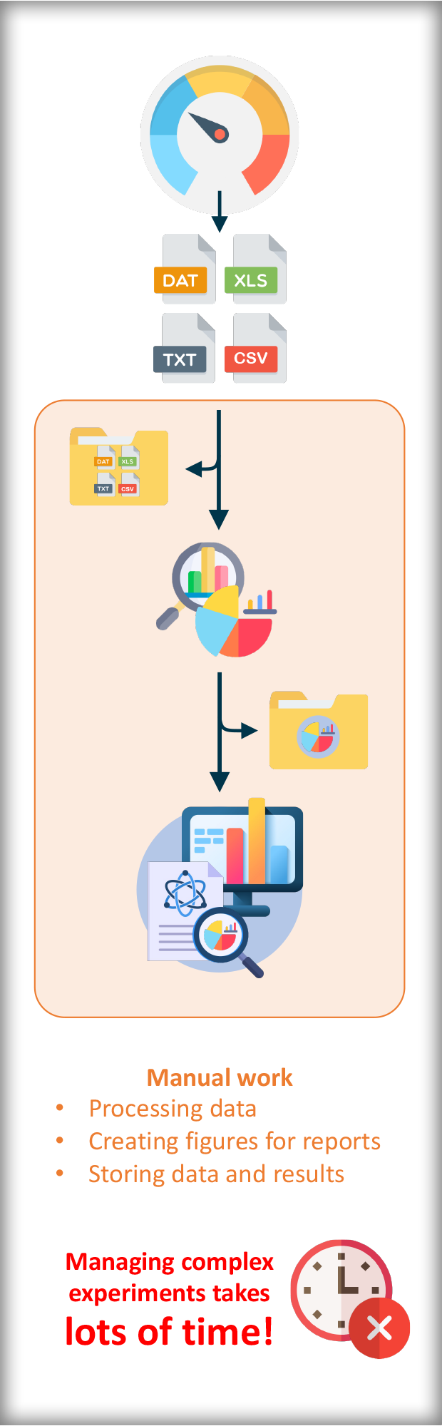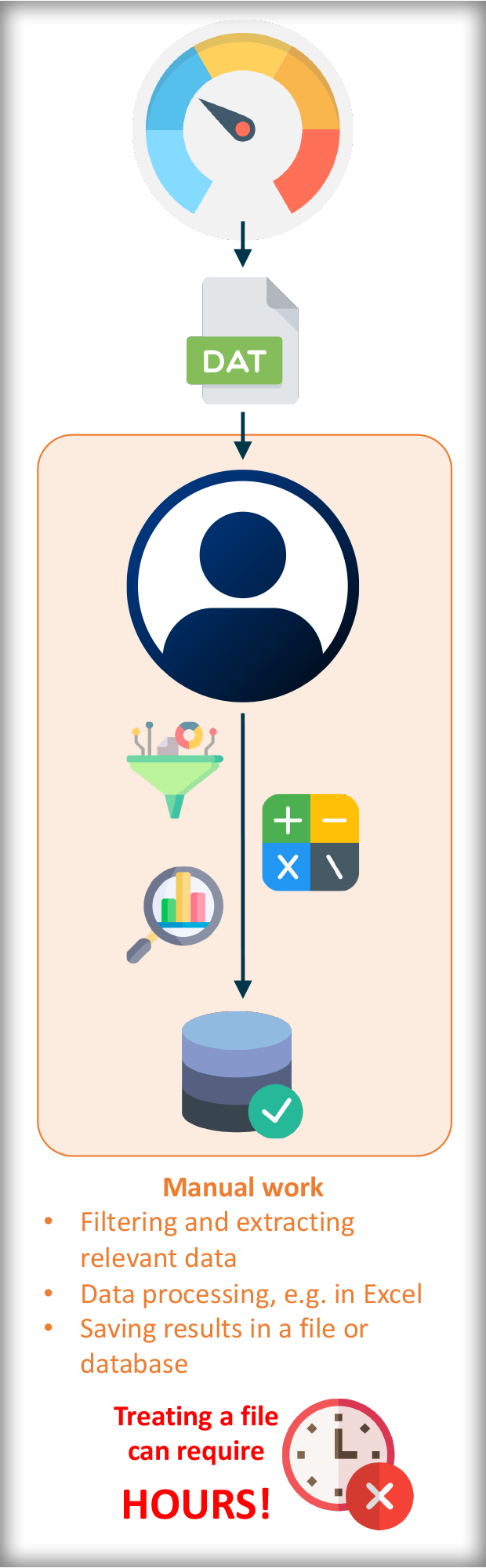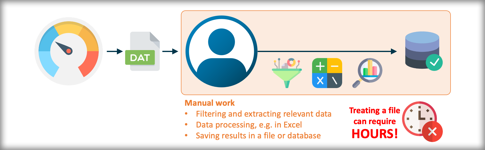 If manually treating only ONE file from ONE piece of equipment can already require several hours, just imagine treating large amounts of files from various different tools, each in a different way and doing this on a daily basis! What a waste of time!