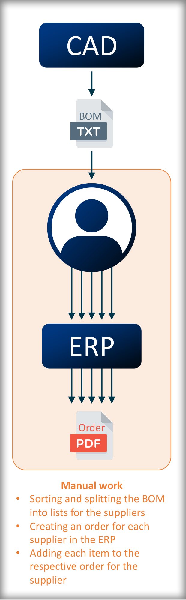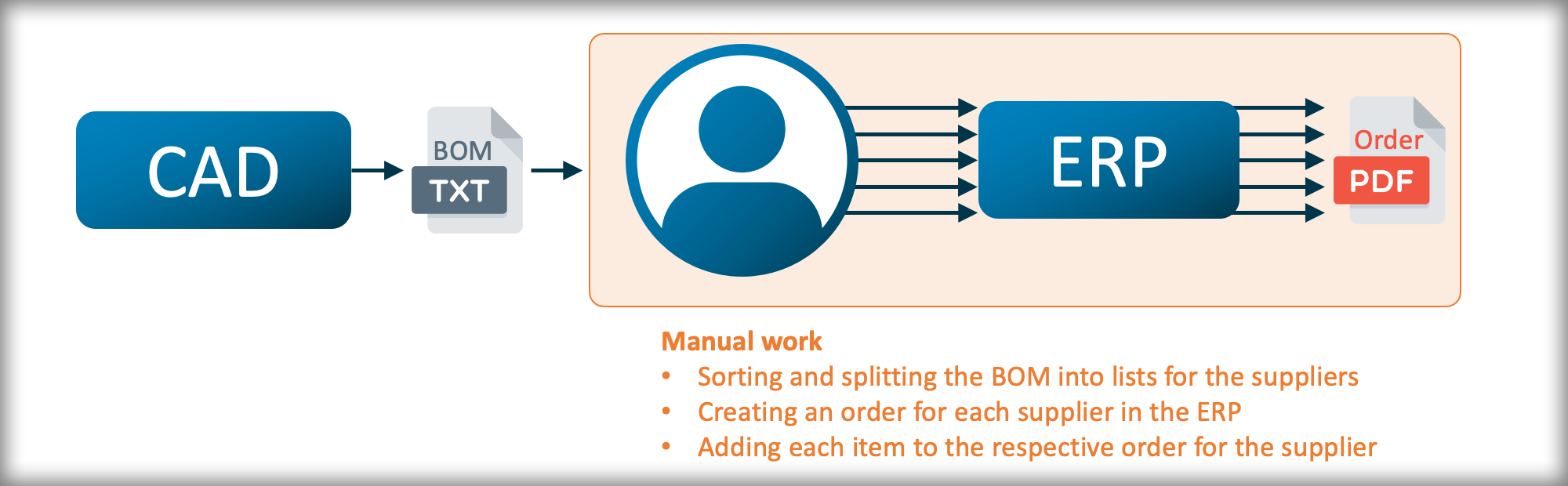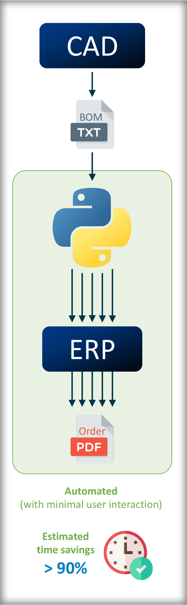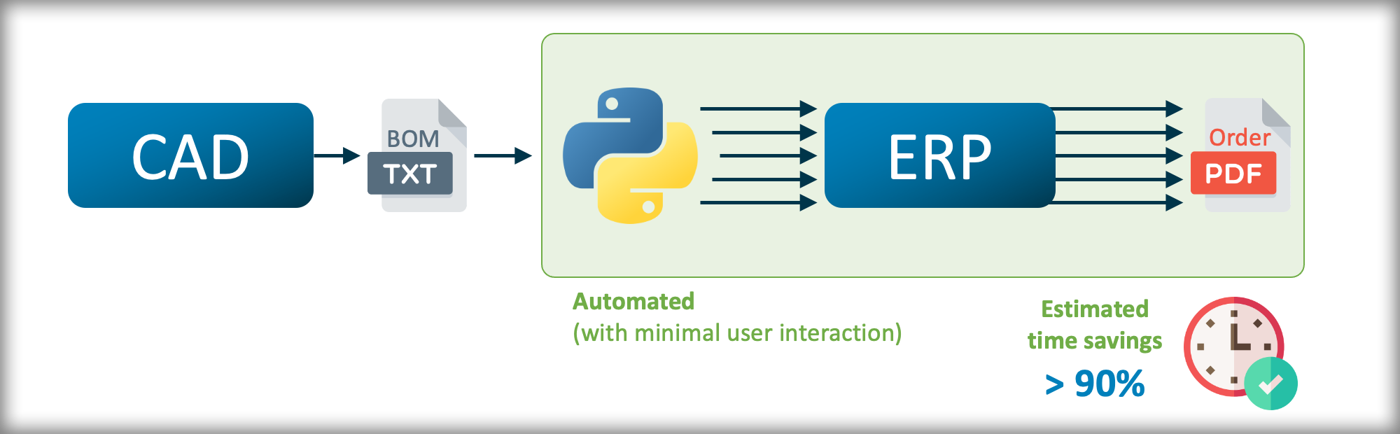 The automated workflow for the ordering process is faster and less prone to errors. Instead of manually splitting the bill of materials (BOM) from a CAD model by supplier and manually creating the orders in the Enterprise Resource Planning (ERP) tool, a Python script can take care of this. It directly interacts with the ERP and automatically creates the supplier orders.