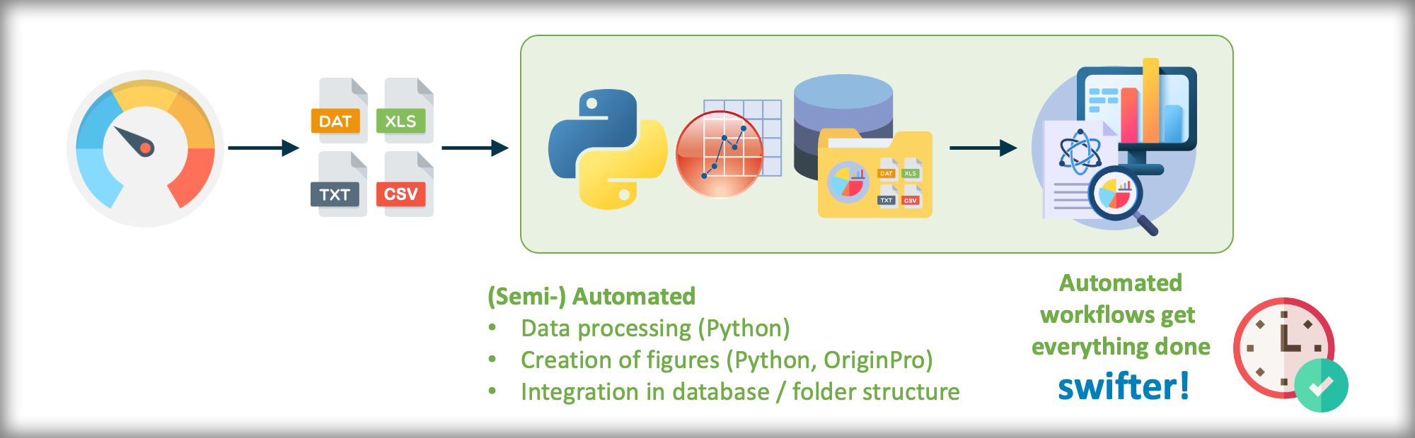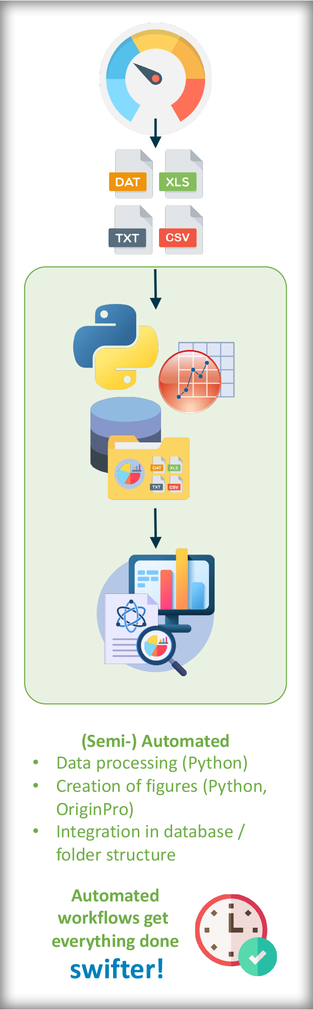 Our expertise in data treatment workflows, accumulated over many years, includes various platforms such as Python, Excel (VBA), and Origin Pro (see examples below). Besides we are constantly exploring new ways, e.g. using Raspberry Pi and Apache NiFi for data treatment challenges.